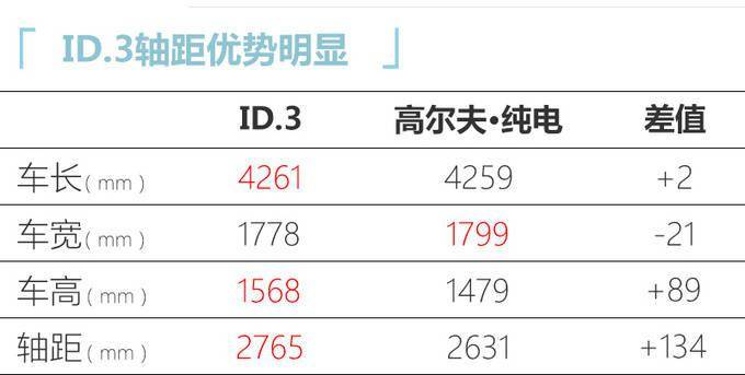 大众ID.3的长宽高分别为4261mm、1778mm、1568mm,和高尔夫纯电比起来,长度仅有2mm的差值,不过得益于纯电平台以及惊人的2765mm轴距比高尔夫足足长了89mm,可以确定的是新车的内部空间则会比同级别大众燃油车有巨大提升。