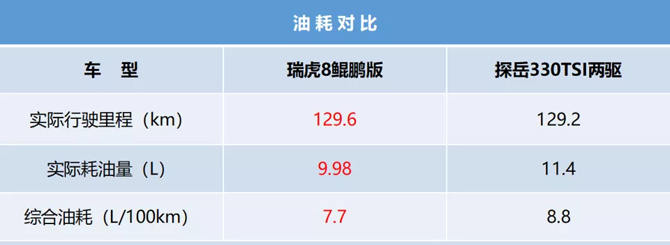 在经过近130公里(含拥堵城市路段和环城高速)的实测后,瑞虎8鲲鹏版耗油量9.98L,油耗7.7L/百公里;探岳耗油量11.4L,油耗8.8L/百公里。燃油经济性方面,瑞虎8鲲鹏版优势比较明显。