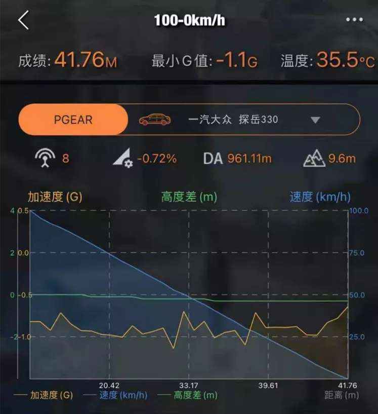探岳的百零制动距离为41.76米。
