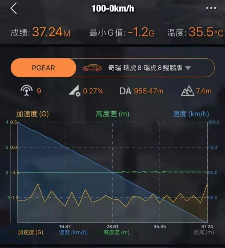 经过实测,瑞虎8鲲鹏版的百零制动距离在37.24米。