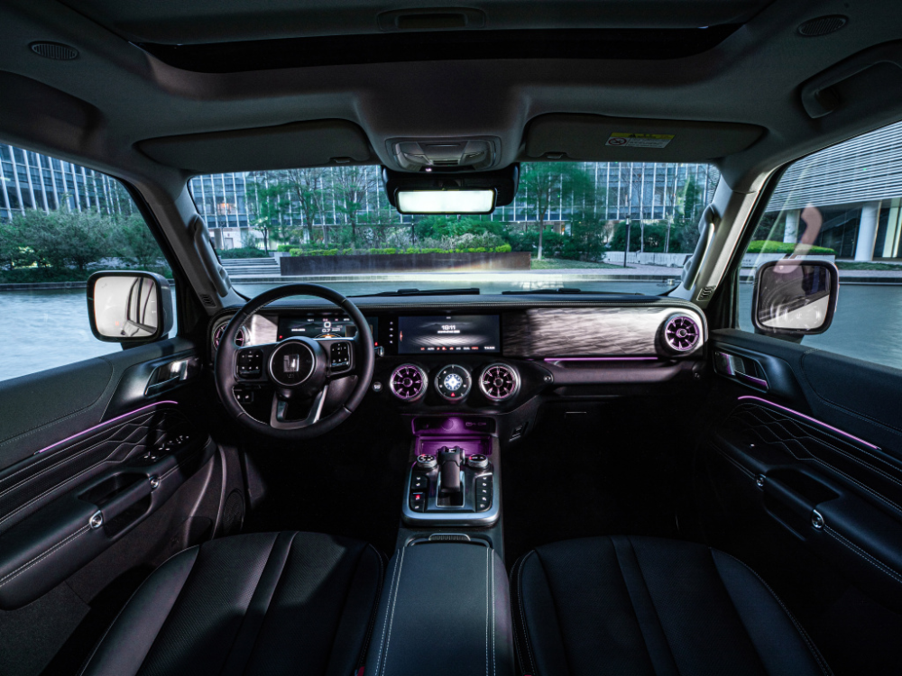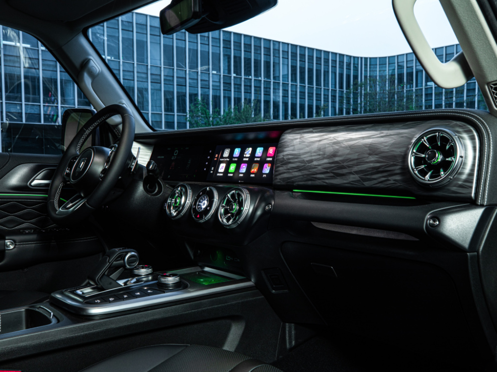 内饰部分,越野版车型配备的双12.3英寸连屏设计得到保留,同时方向盘也是我们熟悉的“T”字造型。新车与现款车型最大的区别在于新增了与车漆同色的装饰及氛围灯,看上去更显年轻运动。此外,舒适性配置上,人机工程学航空换挡杆、座椅通风、加热、按摩等功能也在这台城市版车型上出现。