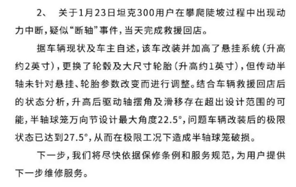 据了解,坦克300于2021年1月开始交付,至今已发生多起断轴事故。