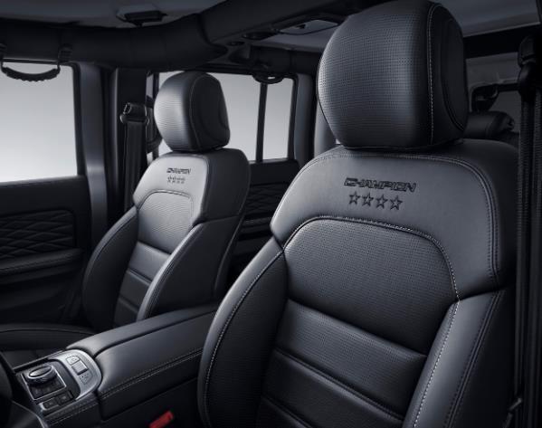 北京BJ40环塔冠军版的性能第三体现在专属的设计独一无二性上,BJ40环塔冠军版天生就是一副硬汉样子,全车以方方正正的线条来勾勒出不拘一格的定位,和城市型SUV的设计完全不同,而且其家族辨识度的五孔式前进气格栅设计,还进行了特殊处理,视觉感更好。并且作为一款特别版本的BJ40,该新车在A柱下方翼子板处还有专属的冠军英文字样以及4星标识,意味着该车是环塔冠军版4星。车身周围的“TAKLIMAKAN RALLY”英文字样表示着环塔拉力赛,说明这是一款受到过多次3500KM拉力赛洗礼的车型。另外在一些细节上像拥有暴风灰专属哑光漆色,专属拉花、座椅刺绣、环塔专属主题显示屏等,凸显出了其独一无二性。