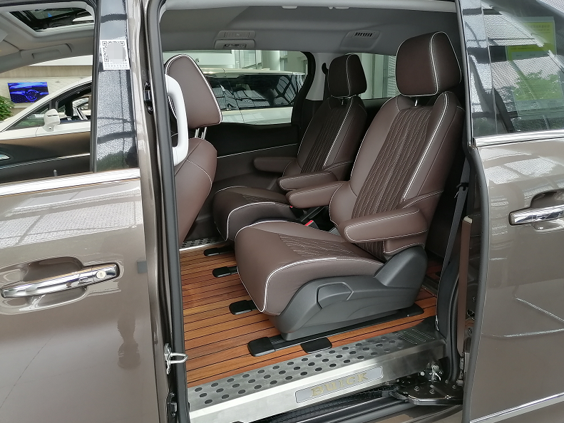 座椅采用的是皮加真皮的设计,第二排的空间特别的宽敞,而且两个座位互不影响,可以支持靠背调节前后移动。从配置上来看,这辆别克GL8加装了实木地板,舒适度不错,但可惜的是,并没有使用上航空座椅。我原本以为2.1万元的加装部分应该是座椅,没想到居然是地板,门踏板位置也采用了铝合金进行装饰,颜值改善得还不错,但是装配工艺一定要好,否则容易割伤。