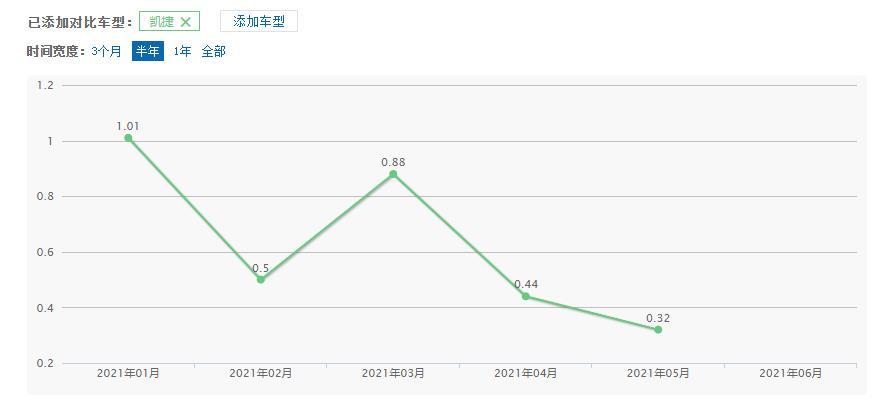 不过,眼下新车的销量表现并不尽如人意。数据显示,在今年1月份凯捷达到了1.01万台的高点后便开始扭头向下,进入震荡区间。其2月份销售新车便环比腰斩至0.5万辆上下,而3月份反弹至0.88万辆,紧接着开始掉头向下,截至今年6月份最新销量公布,凯捷的销量已经实现了三连跌。