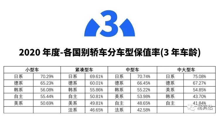 轿车领域,美系小型车三年保值率是50%,紧凑级是49%,中型是53%,中大型是54%,和日系车的保值率差距都在20%左右,同样是20万元的车,三年后的残值差了4万元左右。