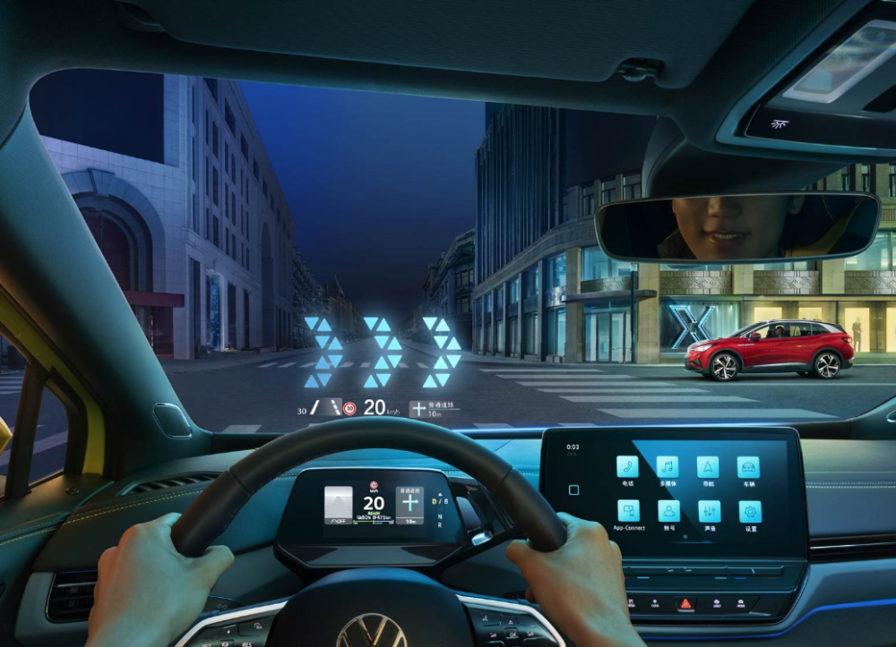 智能配置方面,ID.4 X配备有AR-HUD增强现实抬头显示功能,可以直接将导航、行车信息投射到挡风玻璃上,其设计界面呈现出很强的科技感,行车时也无需低头看导航、车速,更加安全。