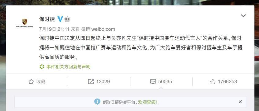 要说本周热度最高的话题是什么,吴亦凡与都美竹的“决战”当仁不让。该事件发生后,韩束、云听APP、王者荣耀、康师傅红茶、滋源、华帝、得宝、乐堡啤酒、腾讯等公司纷纷宣布终止与吴亦凡的代言合作。尤为值得一体的是,在吴亦凡15个代言合作中,唯一的一个汽车品牌保时捷,也在7月19日宣布终止吴亦凡保时捷中国赛车运动代言人的合作关系。