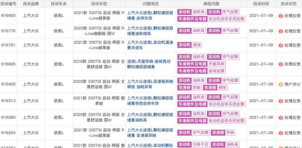 探岳是一汽-大众旗下一款畅销车型,月均销量在万辆以上,是国内SUV市场的前十榜单的常客。但据统计,今年上半年探岳的投诉量为1613宗,远高于排名第二的迈腾。探岳主要的投诉问题包括发动机排气故障、油耗高等,其中发动机排气故障、发动机油耗高是车主集中投诉的问题,多位车主反映探岳颗粒捕捉器堵塞油耗过高,导致车辆出现加速无力,增加油耗,换挡顿挫等情况,从投诉反馈中可以看出,问题多出在2020款车型中。