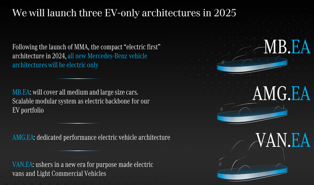 (1)MB EA :这个2024定义的MB.EA和之前的MMA是不一样的,可以理解为专门面向中大型车的平台。也就是说EVA是大型,MMA是紧凑中型,EA是中大型