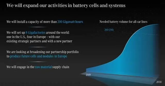 (2)技术和生产准备:计划投产200GWh和8个电池工厂——在这么大的规模下,戴姆勒也需要定义自己的电芯标准,并准备自己的Giga Factory。目前,三家德国车企都已经有自己面向未来的电芯研发合作单位,这也是对未来下注。这么大的投入得要有回报,砸入巨资后总能推动电芯技术有所进步。