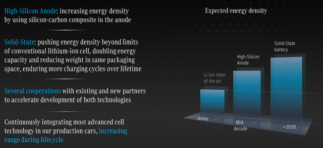 从电池材料和新供应商体系上来看,奔驰的套路也是相似的:和主流CATL合作,扶持孚能大规模供应,在美国找了一家电池初创企业Sila Nano,一起开发900Wh/L 的硅碳负极体系,并可支持快充;开发高硅含量负极,固态电池往1200Wh/L,400Wh/kg这个方向发展,能支持更多充电循环、电池寿命更长。