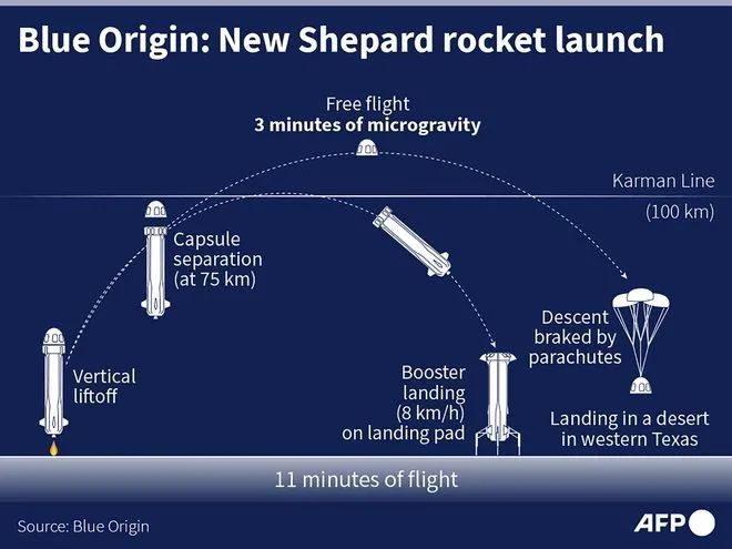 贝索斯的飞行大约会持续11分钟,在此期间,他和其他乘客将经历大约3分钟的失重。与贝索斯同行的还有他的弟弟马克·贝索斯(Mark Bezos)、82岁的女飞行员沃利·芬克(Wally Funk)以及荷兰18岁物理专业学生奥利弗·达曼(Oliver Daeman)。