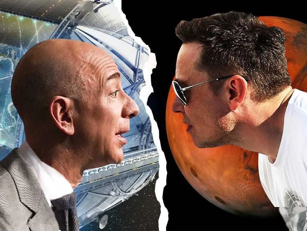 马斯克与贝索斯的竞争由来已久,因为两位亿万富翁都拥有太空探索公司。马斯克的SpaceX制定了明确的目标,即将来能够将人类运送到火星上。马斯克曾表示,他希望帮助人类在这颗红色星球上殖民。