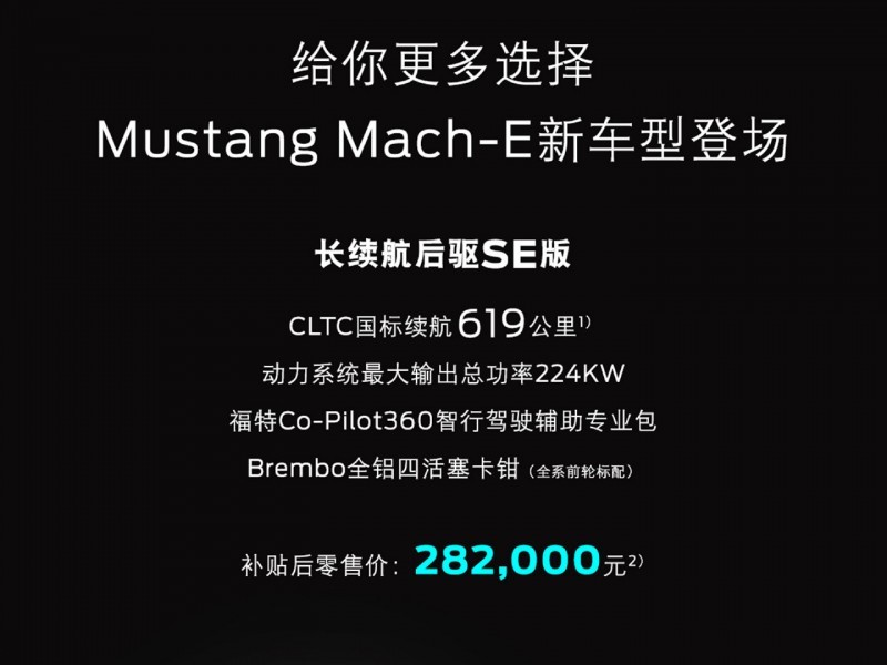 1、价格适中,Mach-E的售价区间为26.50-37.99万元,主力车型SE版本售价28.2万元,续航达到619km,与特斯拉Model Y、大众ID4、极氪001、小鹏P7形成正面竞争格局,综合实力不可小觑。