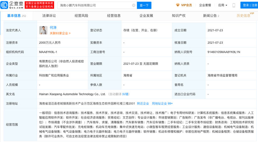 除此之外,盖世汽车还注意到,几天前,小鹏汽车于海南成立了一家新公司。据企查查信息,7月23日,海南小鹏汽车科技有限公司成立,法定代表人为何涛,注册资本2000万元人民币,经营范围包含电子专用材料研发、人工智能应用软件开发、软件开发等。企查查股权穿透显示,该公司由广州小鹏汽车科技有限公司100%控股。