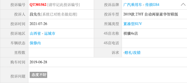 小编通过汽车投诉网了解得知,7月26日一位传祺GS4车主在平台上发布一则投诉,声称自己车辆故障维修完毕后遭到4s店售后人员辱骂。由于事态恶劣,为了解详细情况,小编立即与车主段先生取得联系。
