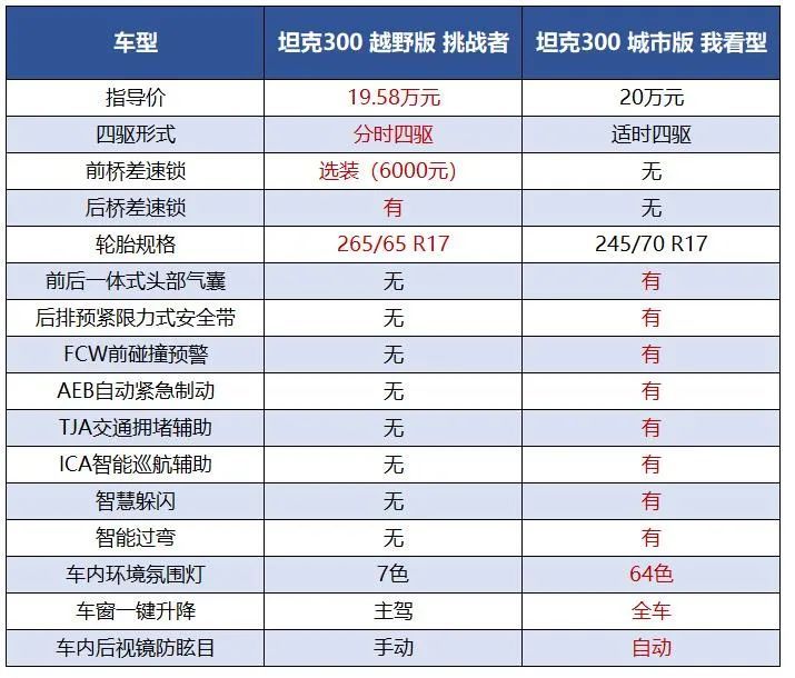 从表格来看,坦克300越野版的功能优势主要体现在“越野”两个字,所以它的优势在于分时四驱,后桥差速锁,以及可以选装的前桥差速锁。而坦克300城市版的功能优势则体现在“城市”两个字上,所以可以看到它比越野版多了头部安全气囊、限力式安全带、FCW/AEB/TJA/ICA等一些列涵盖主被动的安全配置,以及64色环境氛围灯、全车一键车窗升降、车内后视镜自动防眩目等提升便利性、舒适性的配置。