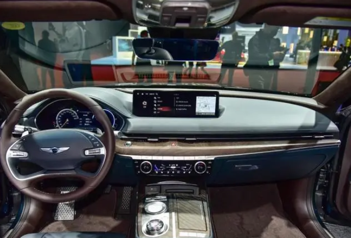 打开车门之后,捷尼赛思G80整个内饰也散发着一股豪华奢侈的气息,可以说整个内饰的用料都非常的高级,再加上四幅式的方向盘,凸显它的高级感。而全液晶仪表盘悬浮式的中控大屏,都有着满满的科技感。并且在细节之处,都有木纹饰板进行点缀,瞬间提升档次感。