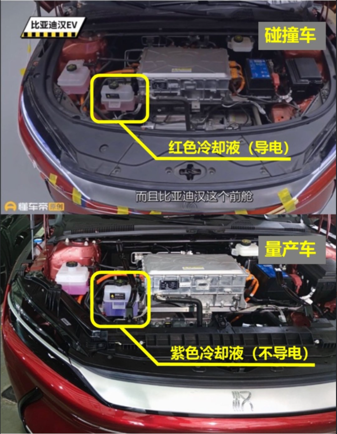 根据比亚迪官方的说法,目前行业普遍使用的冷却液是红色具有导电性的,而汉EV量产车采用的则是比亚迪独有的紫色冷却液,不导电。