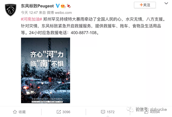 然而,作为汽车行业的一员,东风标致于7月21日中午在官方微博发布消息,针对灾情,东风标致紧急开启救援服务,提供救援车、拖车、食物以及生活用品,并公布了24小时应急救援电话。