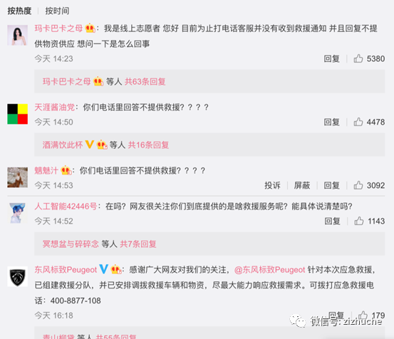 东风标致救援服务信息发布后,多位网友爆料称,拨打东风标致提供的救援电话却被告知不提供救援和物资。为此,网友们纷纷质疑东风标致存在“发布虚假救援宣传”、“蹭灾情热度”。面对网友的质疑,东风标致官方再次发布微博回应:“对本次应急救援,已组建援分队,并已安排调拨救援车辆和物资,尽最大能力响应救援需求。”