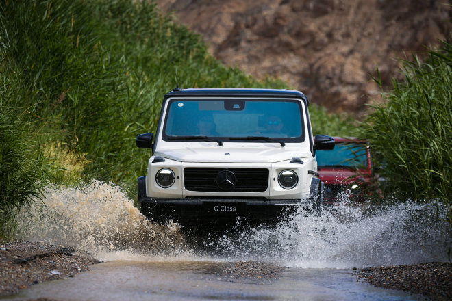 在此行最具挑战的东水沟峡谷越野穿越中,G 63、G 500和G 350齐上阵,凭借家族三大经典“法宝”:梯形车架的非承载式车身、三把100% 差速锁和越野低速挡,面对险峻山石亦能如履平地。
