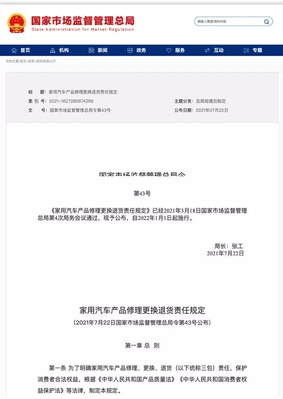 国家市场监督管理总局公布的《家用汽车产品修理更换退货责任规定》的新版“三包”政策会从2022年1月1日起正式实施,而同样原版规定会同时废止。《家用汽车产品修理更换退货责任规定》通俗来说也就是汽车的三包政策,是对所售汽车实行包修包换包退的一种称呼。就像我们去买东西,出现问题,供货方也会对我们的产品进行修理更换,甚至是退货。对于汽车来说也是如此。