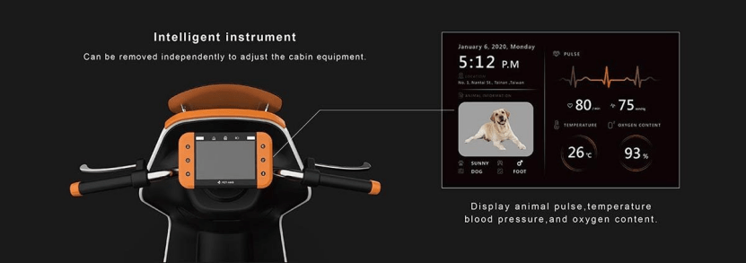 更神奇的是,这辆三轮救护车的仪表盘具备检测功能,可以实时显示车厢内动物的心跳、温度和氧饱和度等生命体征信息,并且对这些关键信息进行记录,以便抵达医院后供医生对病情进行研判。