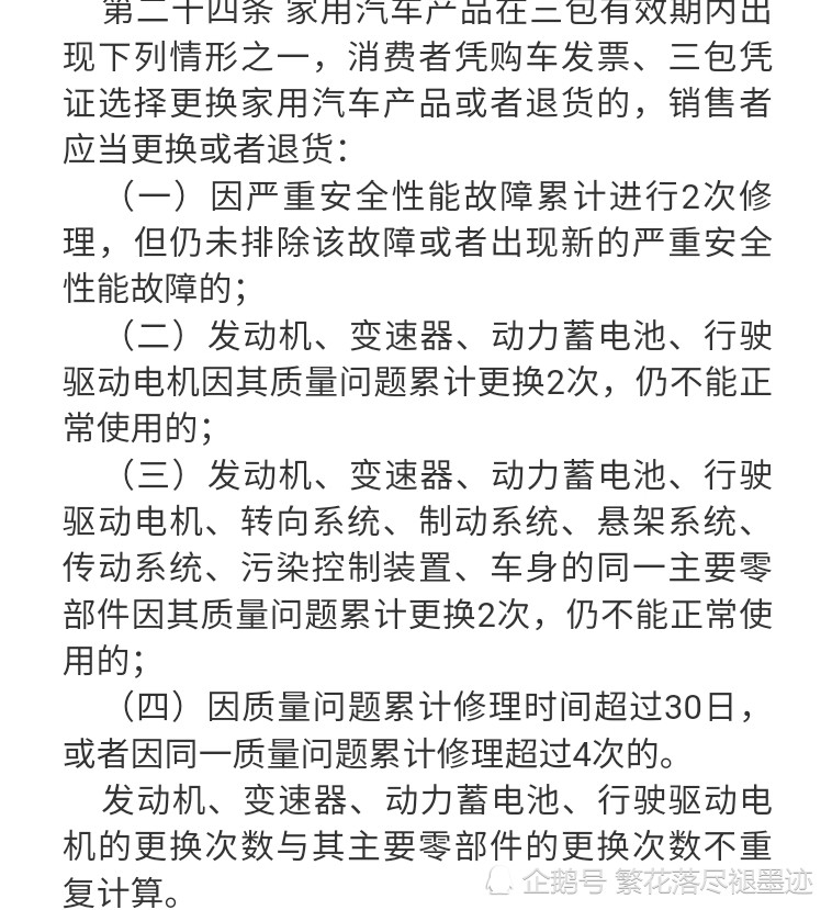 2、由于7天的时效性问题,新规也保留了之前实施的条款,比如:安全性能故障、发动机、变速器、动力蓄电池、行驶驱动电机、发动机、变速器、动力蓄电池、行驶驱动电机、转向系统、制动系统、悬架系统、传动系统、污染控制装置、车身的同一主要零部件因其质量问题累计更换2次均可以退车。