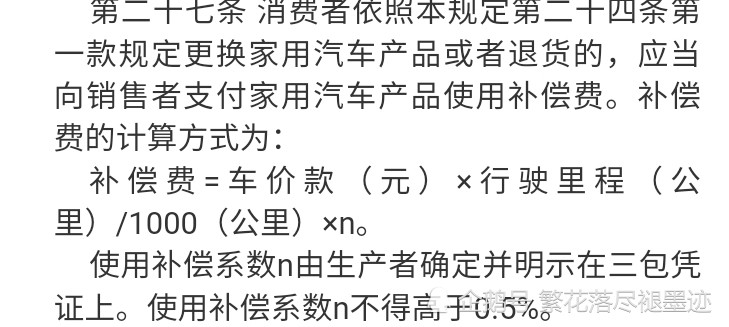 3、因质量问题退车,需要向商家支付一定的补偿比例!计算公式:补偿费=车价款(元)×行驶里程(公里)/1000(公里)×n