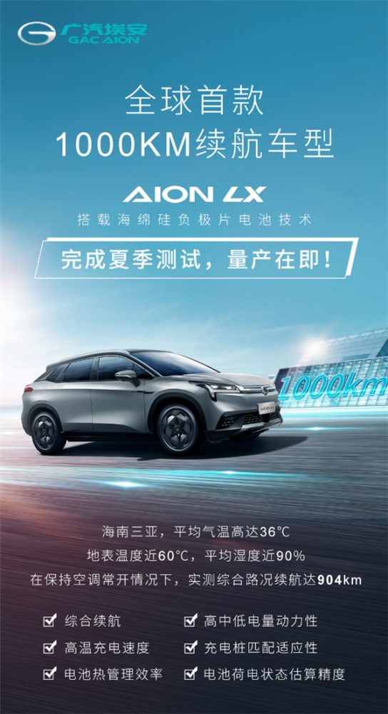 今年7月初,搭载海绵硅负极电池技术的AION LX完成了夏季高温测试。此次测试地点位于海南三亚,平均气温高达36℃(地表温度近60℃),平均湿度近90%,真实的模拟车辆和用户在高温、高湿环境下的使用情况。