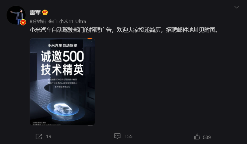 今日午间,雷军在微博发布“小米汽车自动驾驶部门”招聘广告,表示“诚邀 500 技术精英”。