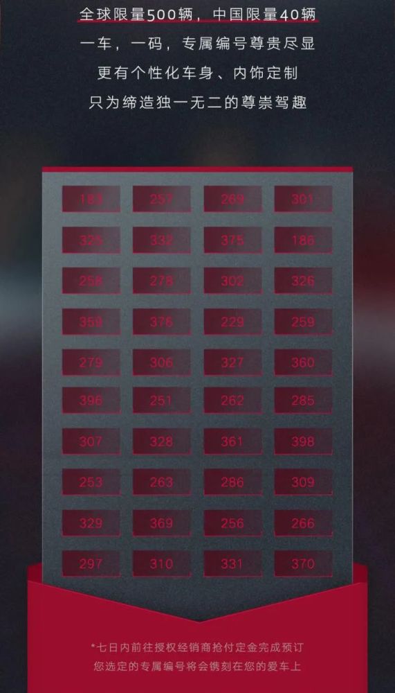 此前也在中国市场开启了盲订,目前中国地区的新车配额为40台,提供了专属的编号数字,缔造出“一车一码”的专享感。值得一提的是,阿尔法·罗密欧似乎非常懂中国的国情一样,提供的40台限量车型里,没有一台专属编号是含有数字“4”,可见阿尔法·罗密欧也考虑到了中国部分含有“死”谐音。