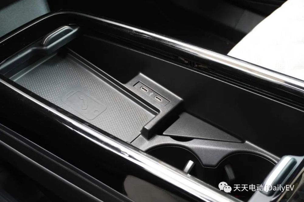 扶手箱前方设有手机无线充电托盘,如果想用线控充电,车内配备的大部分都是Type-C接口,需要额外准备线材。