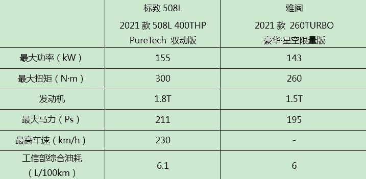 为了能够对比出这两台车的差异,我们选取售价相近的标致508L 400THP PureTech驭动版和雅阁260TURBO豪华·星空限量版进行直观对比。