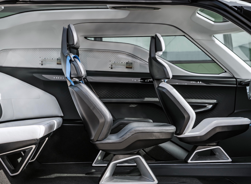 车身侧面设计更有意思,前后车门采用的是双侧滑门设计,前门向前滑动打开,后门则是向后滑动,这就形成了非常巨大的上下车空间,而且由于目前还处于概念阶段,车门打开之后并没有B柱遮挡。这次设计师团队也带来了一些新的设计思路,比如为了取消车身B柱,保证安全性能,后门显得更加厚重,而且根本没有提供玻璃,这就给侧面碰撞带来了更好的支撑性能,所以这种没有B柱的双侧滑门设计完全有可能会保留到量产阶段。