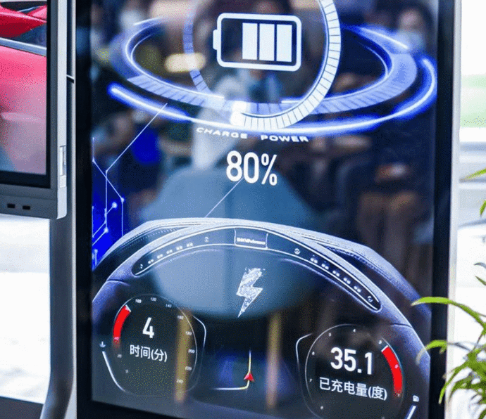 在实际充电展示中,当充电桩显示80%的电量时,充电功率仍达到481kW,充电电压达到855.6V,充电电流达到562.8A,实测4分钟充电量35.1kWh。