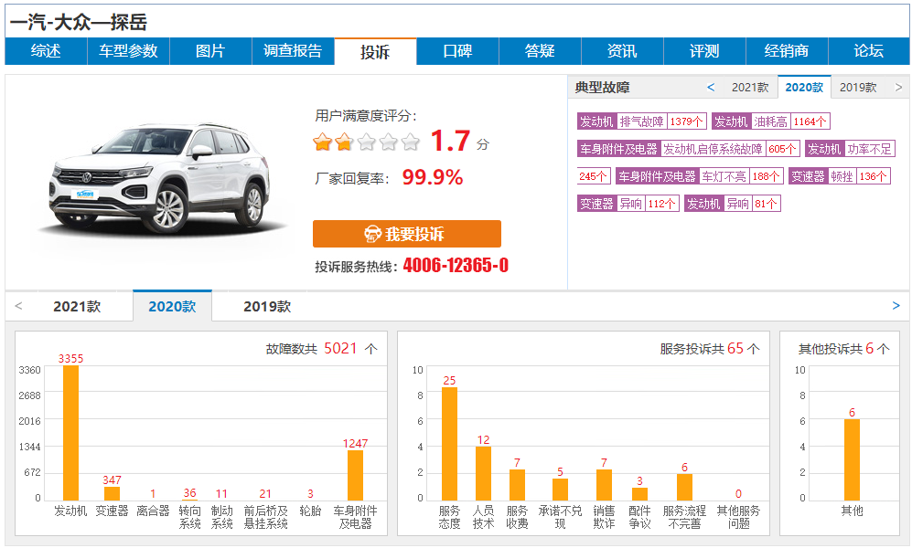 毫无疑问,来自大众家族的热门SUV探岳,在6月的投诉排行中,一定是能登上NO.1的席位。并且,探岳这一波也确实没让大家很失望,在一个月才卖出3000多台的情况下,单月投诉量就高达604例;就投诉比例来看,确实是高得吓人。而这一情况的起因,就是因为大众的颗粒捕捉器故障频发,包括在当月的车主投诉中,也基本都是这一问题。