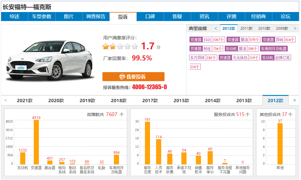 关于福克斯6月的投诉量中,占比最大的就是变速箱这块了,特别是12款车型。据车主投诉显示,变速箱故障主要表现在换挡抖动、无法挂倒挡、脱挡、变速箱控制模块、侵水等方面。以及发动机方面,也收到了一些故障灯亮的投诉。而且在此前的3.15晚会上,福特还因变速箱问题“荣登”名单之上。有一说一,福特品牌最近这些年的市场表现确实有些不尽人意,品控方面感觉也有些懈怠。