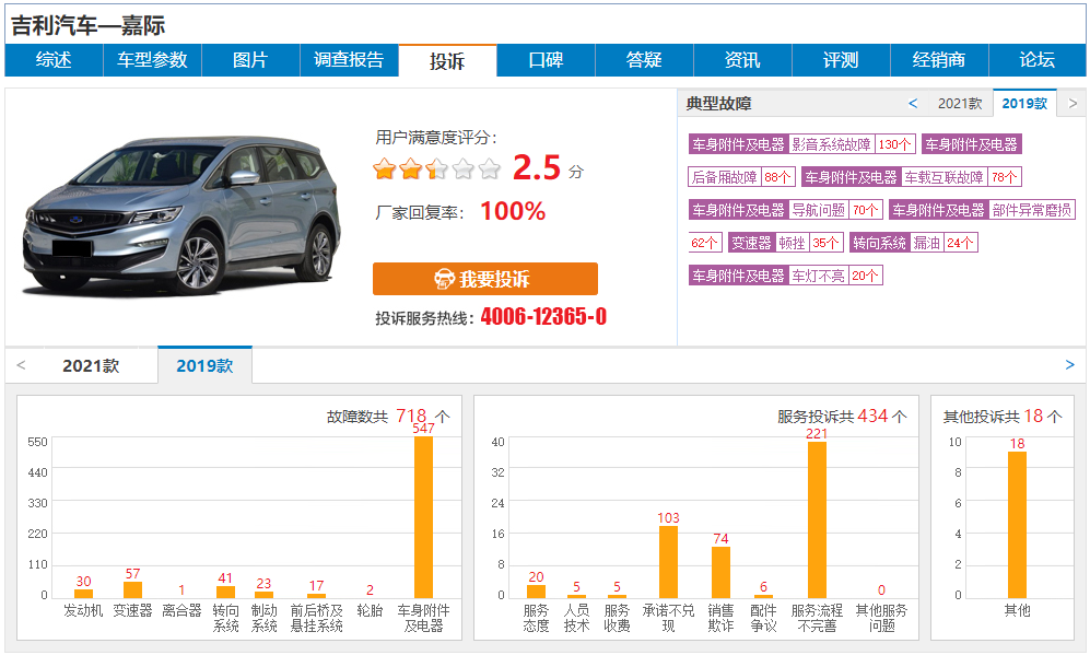 但相对来说,关于嘉际的车主投诉主要还是集中在了车身附件及电器方面。比如影音系统故障、车载互联故障、部件异常磨损等等,以及伴随了小部分变速箱顿挫、转向系统漏油。有一说一,吉利在车机这块的槽点确实都受到了许多车主吐槽,反应慢、卡顿啥的都很影响体验。