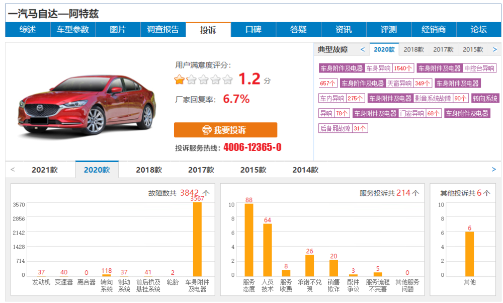 阿特兹的巅峰大概也就止步在了2017年,因为在此之后,阿特兹的存在感和销量都不高,尽管大家都夸它家的6AT变速箱、夸它的操控,但更多的时候阿特兹都是叫好不叫座的尴尬局面。不过在去年,阿特兹可是再度火了一把,但这次可不是什么光彩的事,而是其2020款车型出现了大范围的车身异响。