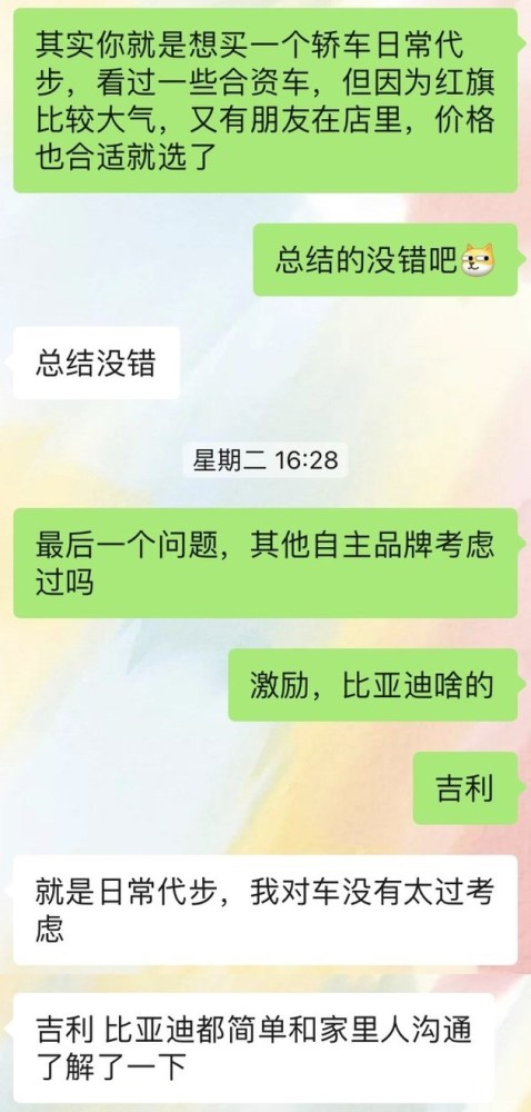 样本量虽然极其有限(就俩),但还是可以从中摸出一些普通消费者在15万以内价位选择红旗车型的心理共性。