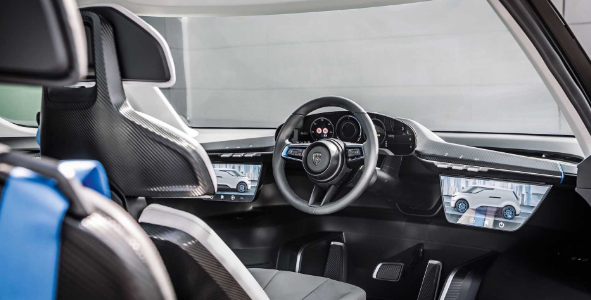 在时尚气息上这个优雅的弧线几乎找不到可以匹敌的对手,展现了保时捷设计的一贯是水准。内饰方面也带来新创意,中控采取对称设计,方向盘很诡异地采用居中设计,两侧各设计一块嵌入式屏幕,驾驶舱也是单座设计,既视感十分豪华。只是不知道这个设计在国内是否允许上路。除了华丽的内饰设计外,在座椅上这款车也别出心裁,十分抢眼。