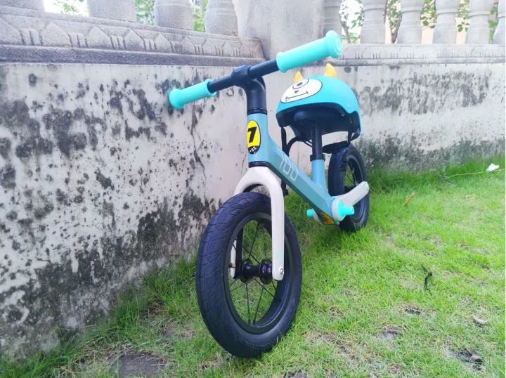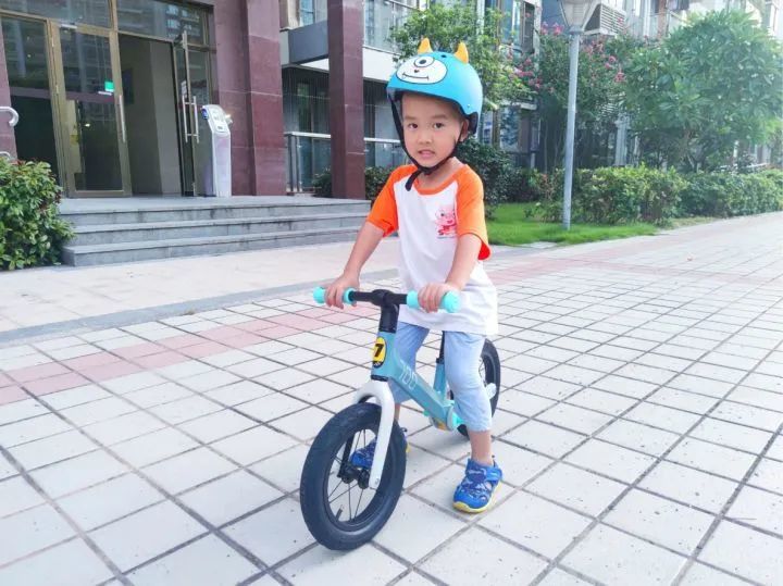 安装完毕后,可以看到柒小佰儿童减震滑步车继承了高颜值的特点,整车相当靓丽,视觉冲击很强,蓝灰黑三色搭配协调,简约而不简单,很符合大众审美。