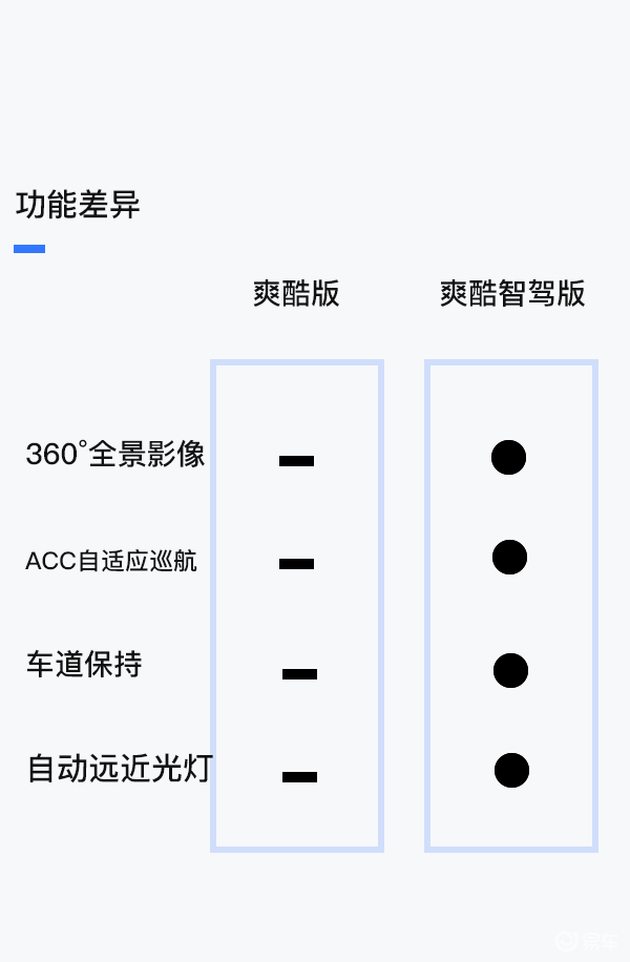 近一万元的差距带来的却是整个L2.5 PLUS驾驶辅助系统的缺失,以及包括360°全景影像、自动远近光灯、后视镜电动折叠、APP远程启动等等一系列的配置差异,在预算合适的情况下,这些配置能够提供很好的驾驶体验。