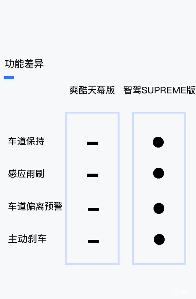 相比起爽酷天幕版车型而言,是将它所缺失的L2.5 PLUS智能驾驶辅助系统缺乏的配置全部都进行了补齐,同时还增加了并线辅助、感应雨刷、双区自动空调等等一系列非常实用的高端配置。因此在预算允许的情况下,不妨考虑一下这款鱼与熊掌兼得的产品。