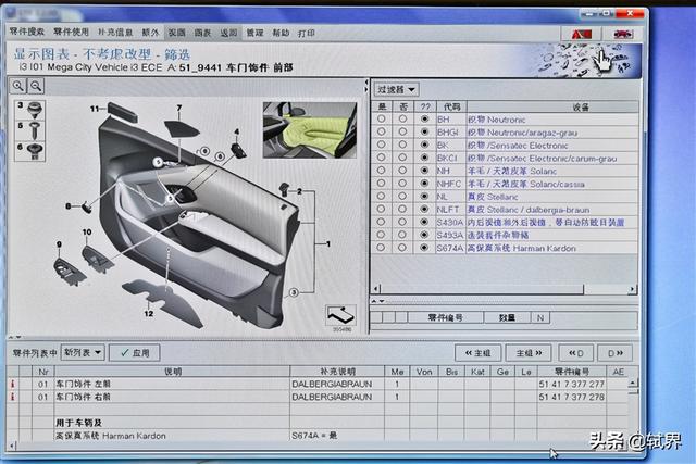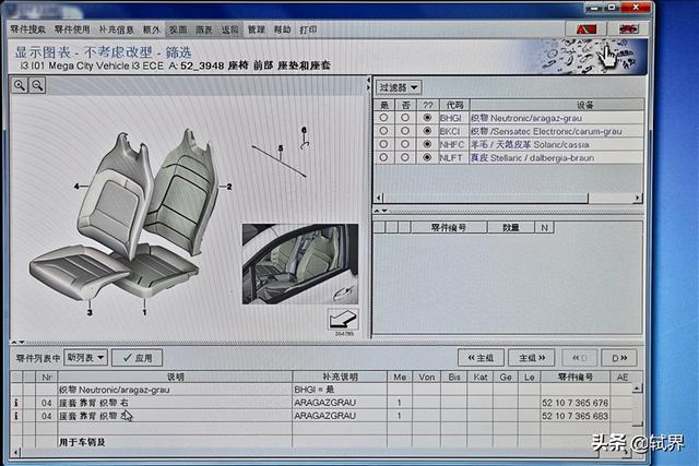 五、卖50万的车,内饰也太糙了吧,仪表台跟毛毡子似的,就没有别的材质可选吗?大师:这个具体要问宝马4S店,但是我们可以查一下配件系统,看看宝马有没有为i3设计各种材质的内饰。