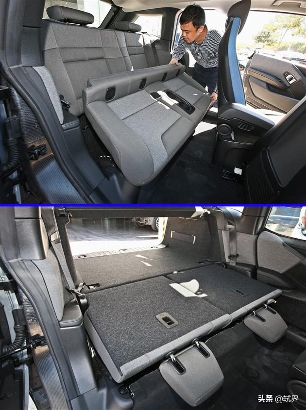 第三,后排座椅是可以拆卸的,拆卸后,后排的靠背可以与后备厢齐平,方便拉货。而且后排坐垫也是碳纤维材质的。一般车后排座椅下面是油箱,i3没有油箱,把iDrive系统主机和一些别的电子元件安放在了座椅底下。