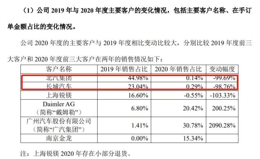 另据公司对上交所针对公司资产减值的问询函的回复函显示,2020年全年公司对北汽集团销售占比下降99.69%、对长城集团销售占比下降98.76%。